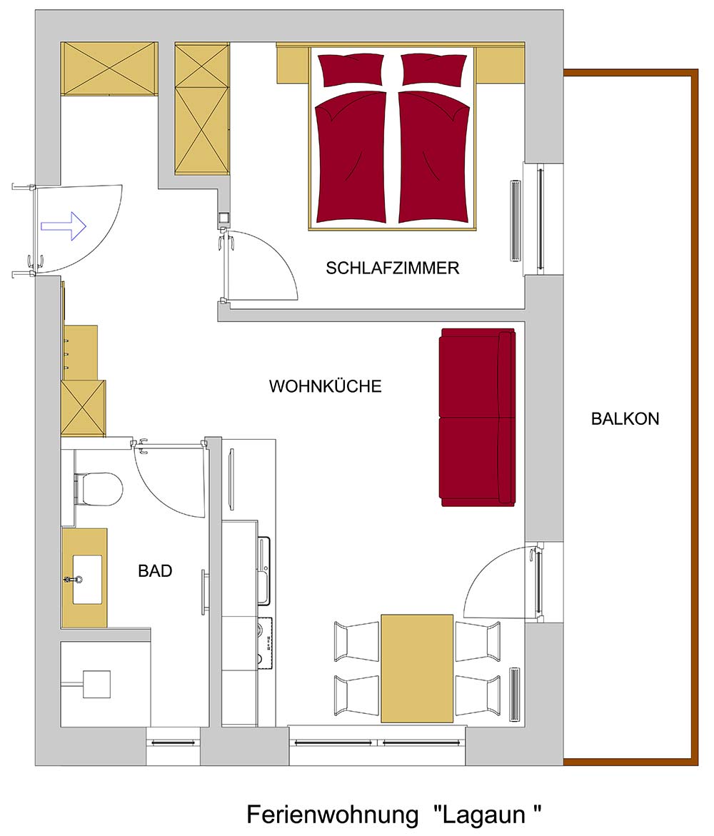 Die Ferienwohnung Lagaun befindet sich im ersten Stock des Bauernhauses und besteht aus einem Eingangsbereich mit Garderobe, einer gemütlichen Wohnküche mit ausziehbarer Schlafcouch für zwei Personen, Sat-TV, WLAN, Balkon, sowie einer voll ausgestatteten Küchenzeile mit Ceranfeld, Backrohr, Dunstabzugshaube, Kühlschrank mit Gefrierfach, Mikrowelle, Kaffeemaschine, Toaster, Wasserkocher und dem gesamten Koch- und Essgeschirr, einem Schlafzimmer mit Doppelbett und einem Badezimmer mit Dusche, WC, Handtuchtrockner und Bodenheizung. Der Balkon ist östlich ausgerichtet und ist mit Sitzmöglichkeiten, einem Liegestuhl mit Sonnenschirm und einem Wäscheständer ausgestattet.