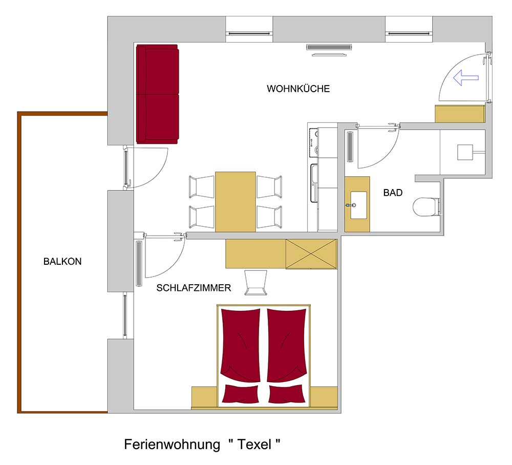 Die Ferienwohnung Texel befindet sich im ersten Stock des Bauernhauses und besteht aus einem Eingangsbereich mit Garderobe, einer gemütlichen Wohnküche mit ausziehbarer Schlafcouch für zwei Personen, Sat-TV, WLAN, sonnigem Balkon, sowie einer voll ausgestatteten Küchenzeile mit Ceranfeld, Backrohr, Dunstabzugshaube, Kühlschrank mit Gefrierfach, Mikrowelle, Kaffeemaschine, Toaster, Wasserkocher und dem gesamten Koch- und Essgeschirr, einem Schlafzimmer mit Doppelbett und einem Badezimmer mit Dusche, WC, Handtuchtrockner und Bodenheizung. Der Balkon ist südwestlich ausgerichtet und ist mit Sitzmöglichkeiten, einem Liegestuhl mit Sonnenschirm und einem Wäscheständer ausgestattet.